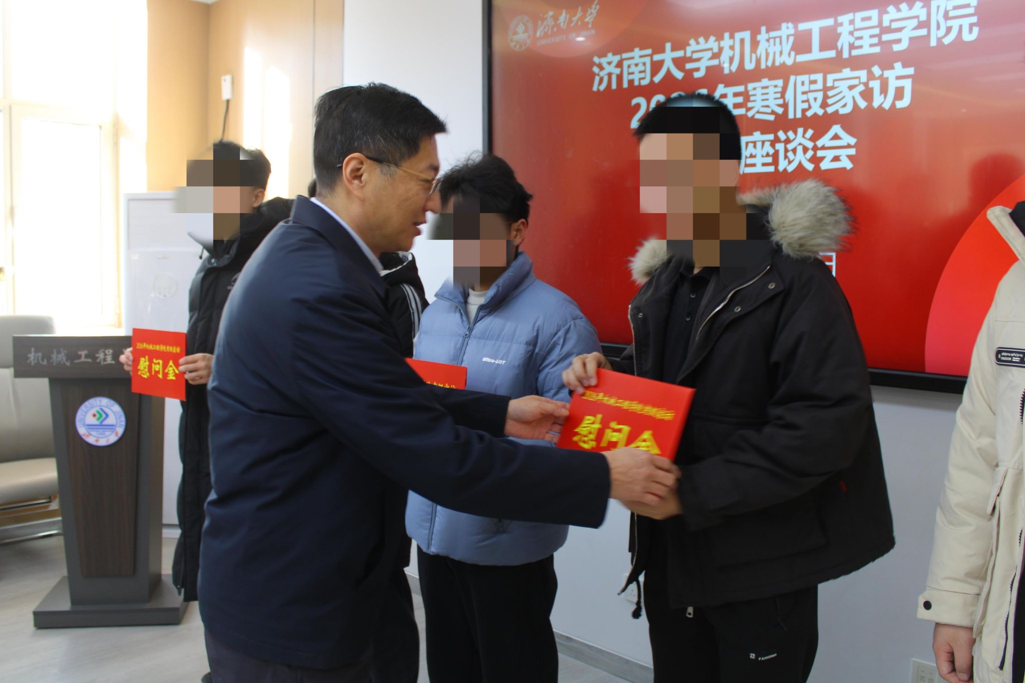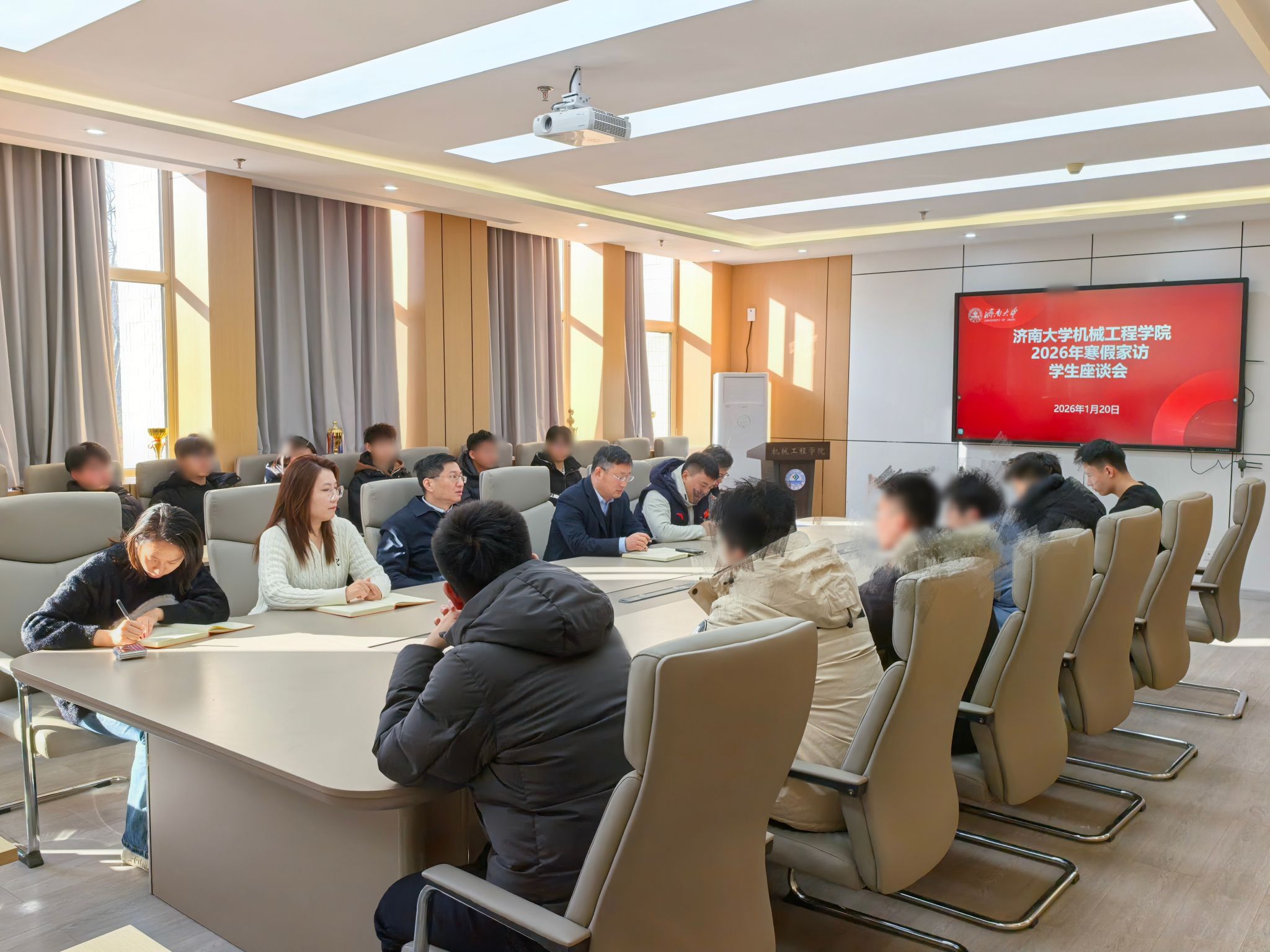 机械工程学院积极响应学校组织开展的2026年寒假家访活动,学院认真筹备、精心部署,1月20日上午,在机械楼a324开展2026年寒假家访学生座谈会。学院党委书记程涛、学院党委副书记孙成政、各年级辅导员及部分家访学生参加座谈会,座谈会由学办主任宁大千主持。